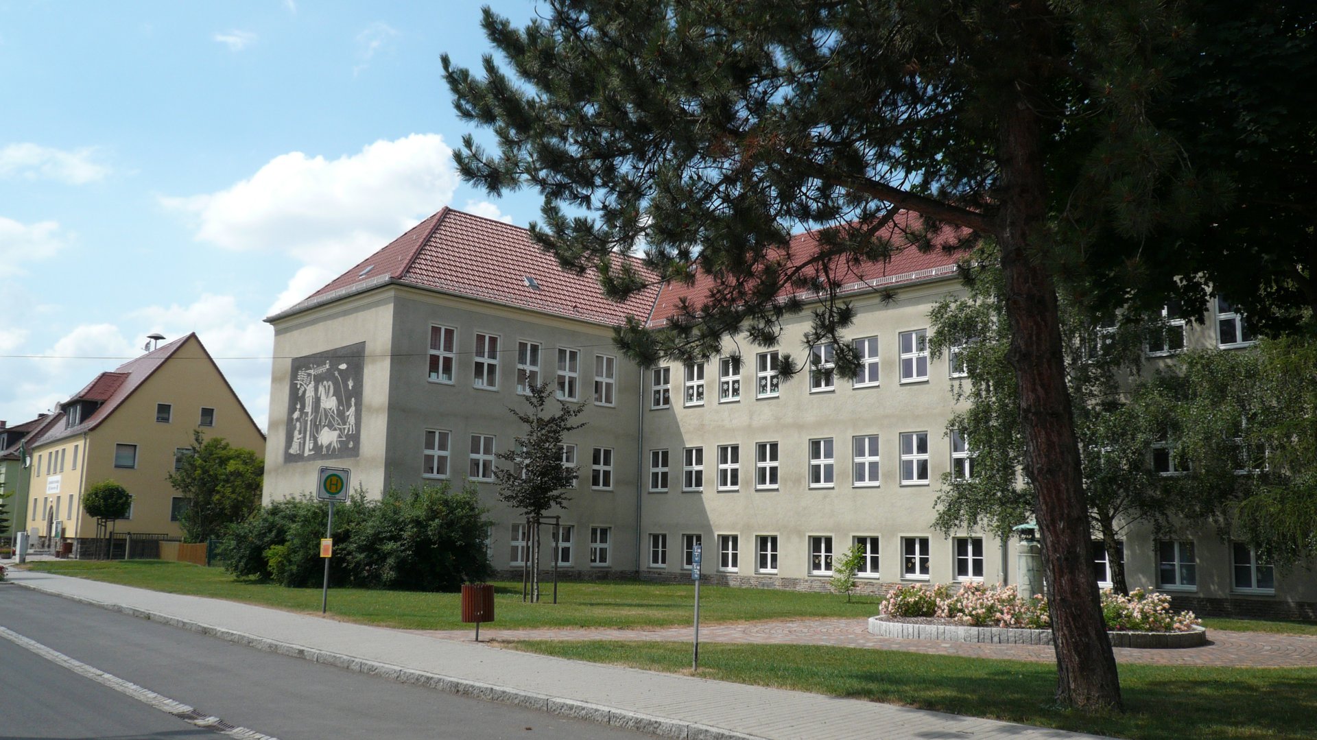 Seit über 55 Jahren besteht in der kleinen Gemeinde Elstertrebnitz eine Schule für Lernförderung. Das typische Design der 1950er Jahre, in dem das Schulgebäude gehalten ist, ist für sich selbst gesehen nicht sonderlich herausragend, gäbe es da nicht das Sgraffito an der Giebelseite. Als Sgraffito, von italienisch „sgraffiare“ für „kratzen“ abgeleitet, bezeichnet der Fachmann eine spezielle Art der Verputzung. Bei dieser historischen Technik zur künstlerischen Bearbeitung von Wandflächen werden durch die Auflage von verschiedenfarbigen Putzschichten schmuckvolle Wandbilder geschaffen.